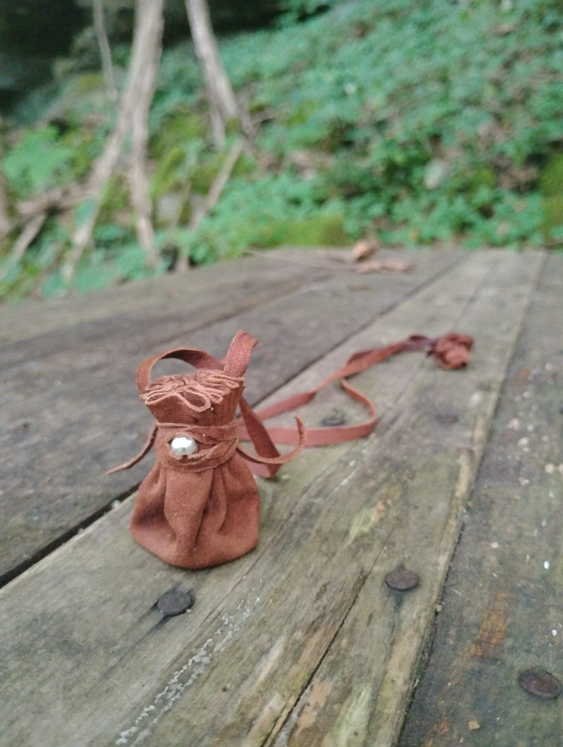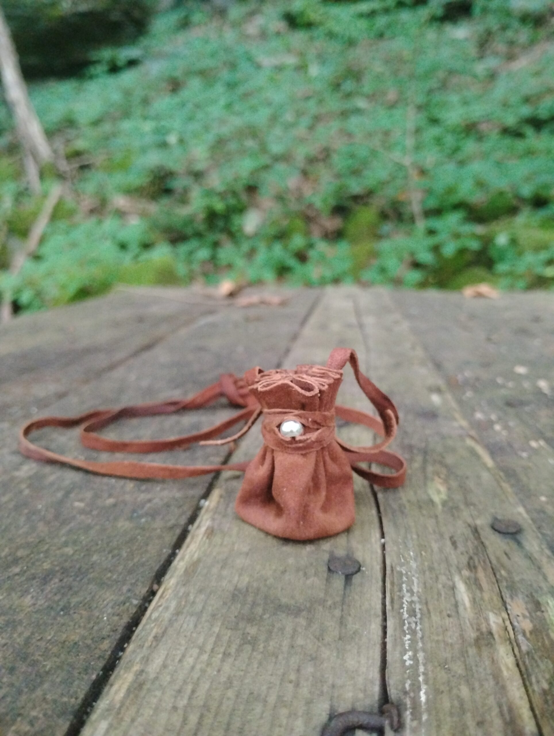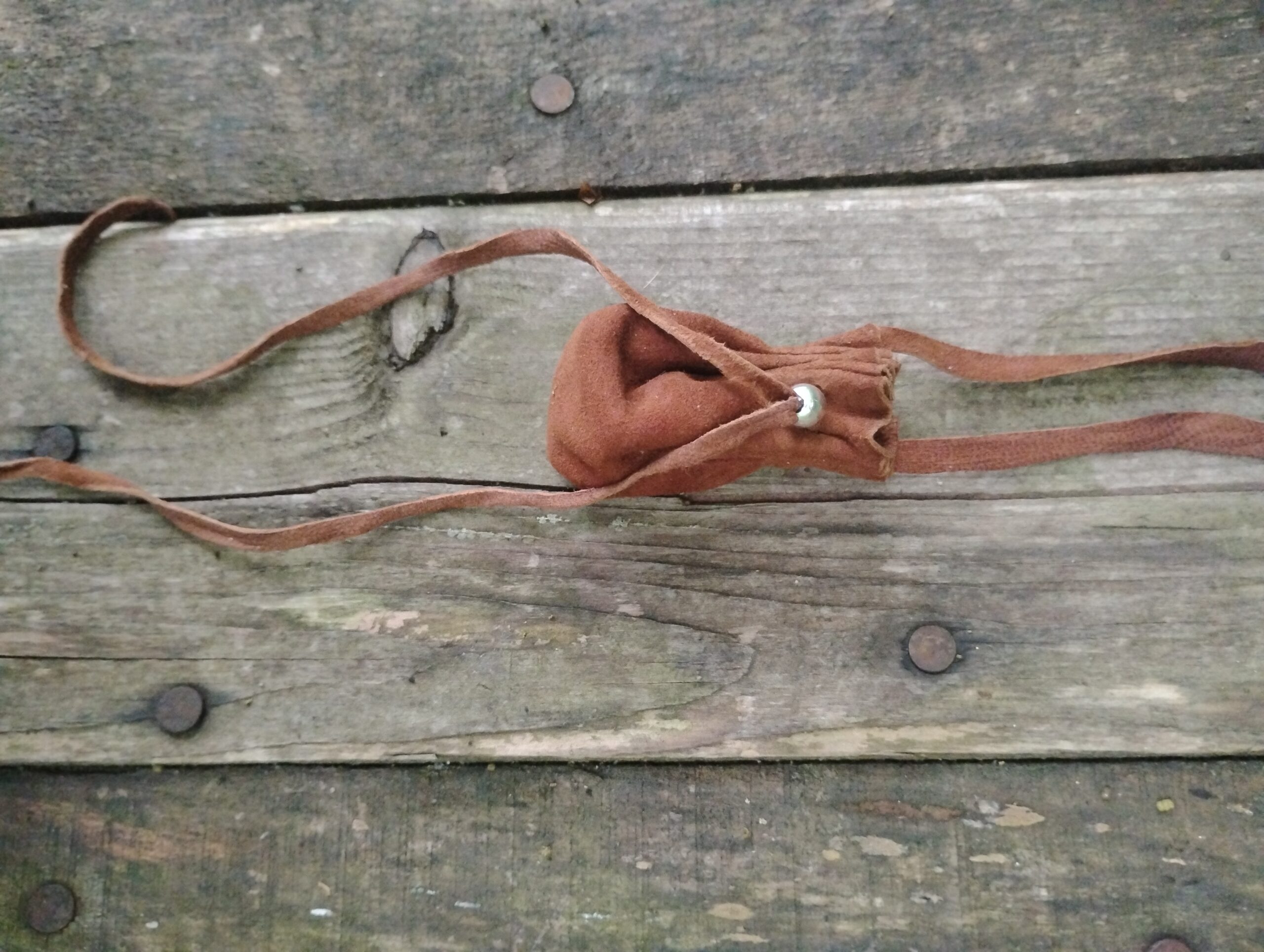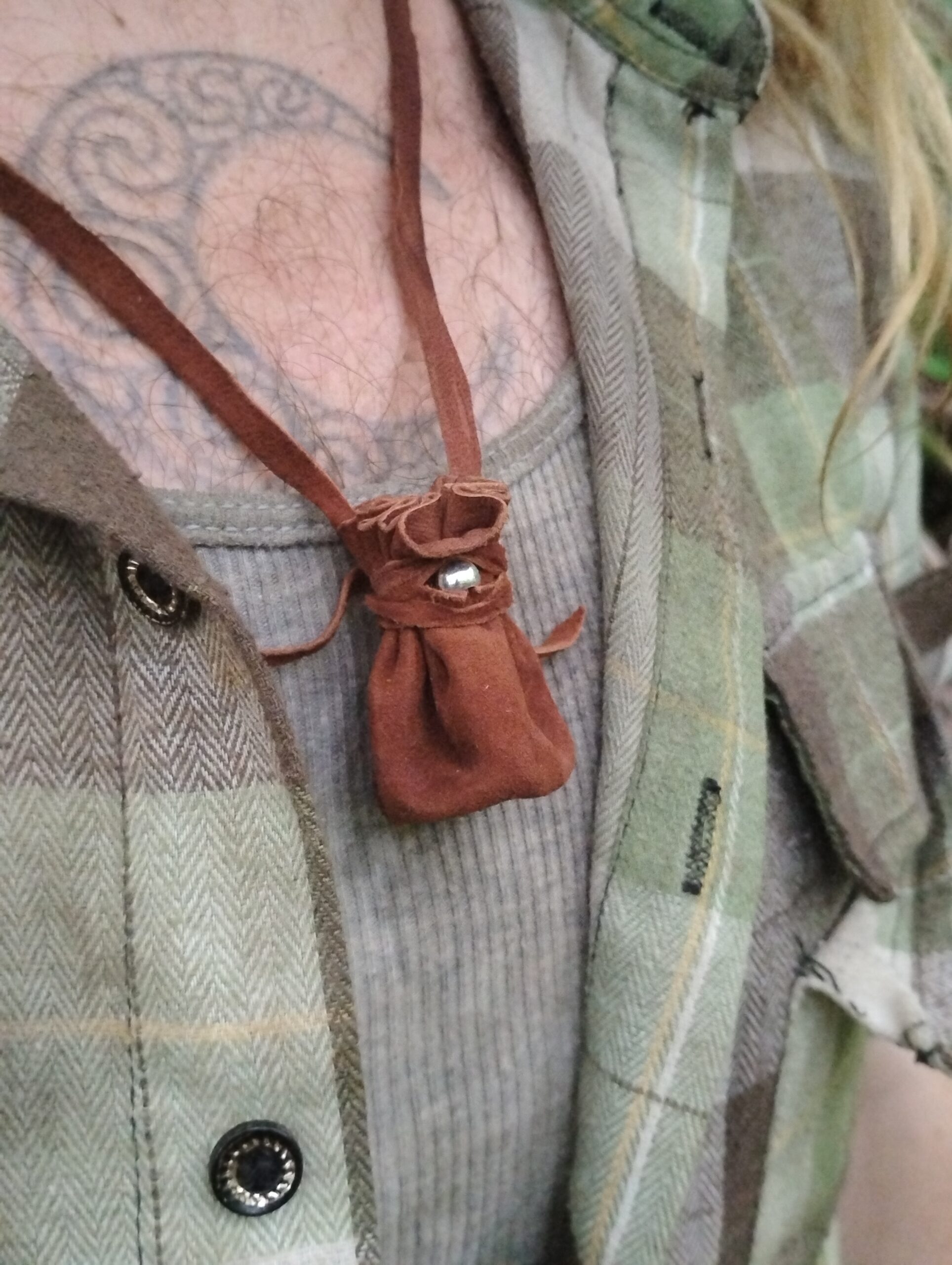 Materials: Solid .925 sterling silver bead & buckskin leather. May choose to have it treated with mink oil for aiding in water resistance as well as darkening the appearance of the leather and softening the bag. If you would like to choose this option, please purchase our other product listing. Made to order. Approximate handling time varies – may take up to 3 weeks. Please email us for any questions at info@steepinthewoods.com